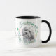 Cada lado de esta taza tiene un hermoso retrato acuarela de un adorable perro habanés blanco en una corona azul de hojas verdes. Entre las dos imágenes hay un texto que dice "AMAR MI HABANESE" en negro. El texto puede cambiarse fácilmente, o incluso eliminarse, si lo prefiere.