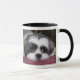 Un perro blanco y negro lindo de Shih Tzu que coloca en una manta color de rosa/rosada. La imagen adorable de la fotografía de la raza del perro de Shih Tzu imprime.
