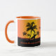 Diseño que practica surf personalizado con nombre y el año de nacimiento adaptables con la prueba que persigue la onda, persona que practica surf que camina en la playa con la tabla hawaiana en las palmeras tropicales del pasado de la puesta del sol con el océano que relucir en el fondo
