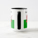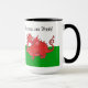Una taza blanca con una llanta y mango negros y un lindo dragón rojo galés y 'Gales para siempre' en galés, con letras negras, que puedes cambiar o borrar si lo deseas; de un ilustracion pintado a mano por Judy Adamson.