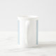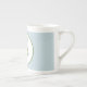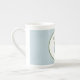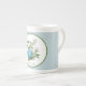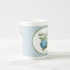 Taza hermosa de la porcelana de hueso con un fondo azul y un adorno floral botánico de hydrangeas en un panel circular central. Personalizado con un nombre. Haría un regalo o un acento perfecto para su hogar del estilo del vintage. Para más hogar los accesorios ven que hacen compras los nudos y los besos.