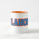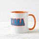 Este tazón de café personalizado presenta un diseño que muestra la palabra "Oklahoma" en una letra de impresión de boxeo con un contorno color naranja de letras azul acua en este tema del estilo jersey del orgullo del estado personalizado. La llanta y la manecilla están acristaladas con colores a juego disponibles en la construcción de cerámica de microondas y lavavajillas de 11 onzas o 15 onzas.
