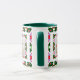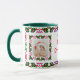 Personalizado Fun Jolly Navidades Green Pattern Foto Tea Coffee Mug. En colores tradicionales de rojo y verde, con toques de naranja cálido morado y brillante; en un alegre patrón multicolor, maximalista. Para las bebidas calientes de invierno y el alegre chocolate caliente en las acogedoras noches. Cambia las dos fotos y el texto a tus propias fotos y palabras, para celebrar los recuerdos familiares. El texto predeterminado dice "Mamá es Feliz Navidad Mug", en rojo y verde. Compra como regalo de vajilla para mantener el sake festivo para ella o sus abuelos.