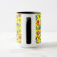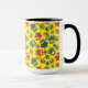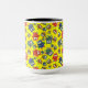 Una taza de Ringer blanca con el labio y la manecilla negros y un patrón de búhos lindos en rojo, azul, verde sobre un fondo amarillo, que se puede cambiar fácilmente usando el botón de edición. El patrón de búho fue un diseño original de collage de papel pintado a mano de Judy Adamson.
