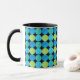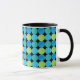 Una taza de moda de Ringer blanco y negro con un audaz patrón de "rejilla" de las lunas azules en turquesa, verde neón y Verde azulado sobre un fondo negro que se puede cambiar si se desea - Azul o Blanco también se ven bien. Parte de la colección "Blue Moons" de Posh & Painterly.