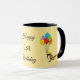 Un ilustracion de un lindo gorrión kawaii personalizado con globos de cumpleaños coloridos. Celebra el fiesta de cumpleaños de tus hijos con este diseño de necesidades fiestas, accesorios para regalos. Personaliza o personalizar esta taza con tu propio texto. Esta taza puede ser un buen regalo o un souvenir para su huésped.