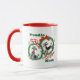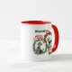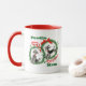 Adorable Cute Fun Retro Christmas Poodles Wreath Custom Mug for Poodle Lovers. Two adorable Gray/Black Poodles! Each Poodle is wearing a red collar with a bell on it, and is framed with a pretty Holly Christmas Wreath and Merry Christmas text design. Personalize it with your ideal text.