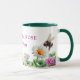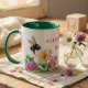 Personalized Green Watercolor Bee Spring Vibes Mug. A charming watercolor design featuring a bumble bee, daisy, wild rose, clover, and white spring blossoms on a sleek white mug with hunter green interior. Add your name and make it uniquely yours — perfect for cozy spring mornings.