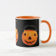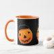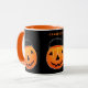 Creative Halloween party mugs or gifts featuring cute Jack-o'-lantern pumpkins. To personalize edit text to add her or his name.