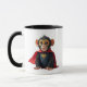 Un bébé singe porte un costume de super-héros avec une cape rouge qui flotte derrière lui. Il a un masque doré qui lui donne un air mystérieux et un logo en forme de S sur son torse. Son pelage noir et ses grands yeux brillants le rendent très expressif. Il a l'air courageux et prêt à sauver le monde. Sa posture fière et son sourire discret lui donnent un style original.