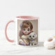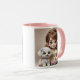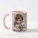 Taza Petite fille au bandeau fleuri et son chiot blanc.