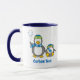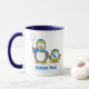 Un pequeño pingüino personalizado con bola de nieve y uno desmayado. Texto personalizado en ambos lados.