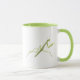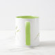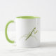 La pintura de un antis rezando de Cheryl Paton se imprime en dos lados de tazas personalizados. El color de fondo se puede personalizar. La mantis de oración es un insecto verde grande.