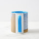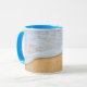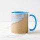 Una taza con una fotografía de una playa de arena dorada marrón y surf de espuma blanca.