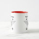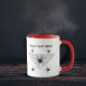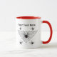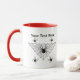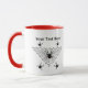 Este tazón de café o té tiene telas de arañas negras en forma de triángulo con arañas de viudas negras envenenadas con marcas de vidrio rojo en las redes. Personalizar el texto con la plantilla.