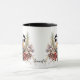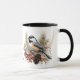 Esta es una taza de bonito para cualquiera, con la imagen de un pequeño pollito pert encaramado en una rama de pino con un cono de pino y bayas rojas. Detrás de las imágenes de las aves hay un rastro de un remolino de oro. La imagen se repite dos veces en la taza, con tu nombre en negro entre ellos. ¡Una escena de bonito en cualquier época del año!
