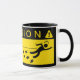 Signo de precaución amarillo y negro con piranas persiguiendo a una figura de palo.