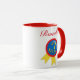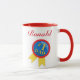 Ideal para el Día del Padre o para el cumpleaños de papá, esta taza de café muestra una cinta de recompensa roja, azul y amarilla que dice "Número 1 de Papá".  Encima de la cinta está el nombre de papá escrito con letra cursiva roja.