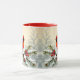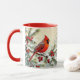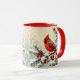 A beautiful Christmas coffee mug with a vintage cardinal sitting on a pine branches covered in snow and red berries.