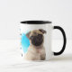 Un retrato de un adorable Perro Pug es la característica en dos lados de esta taza. Cada imagen se coloca sobre un fondo de salpicadura azul brillante. Entre las dos imágenes está el texto que describe a este leal y amoroso compañero, con "el perro PUG" en negro en la parte inferior. Todo el texto se personaliza fácilmente para que puedas describir a tu propio amigo leal.