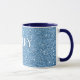 Nombre personalizado tazón de café azul. Esta taza de café de moda está decorada con un fondo purpurina brillante simulado. Se personaliza con un nombre personalizado impreso en una clara impresión blanca con un delgado contorno azul oscuro. Personalizar con tu propio nombre o conviértelo en un encantador regalo personalizado.
