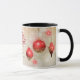Esta taza festiva de Navidad tiene un elegante guión rojo que dice "Feliz Navidad" y texto dorado que dice "Feliz Año Nuevo" en el medio. A ambos lados del texto, tres bombillas de purpurinoso rojo brillante cuelgan desde arriba. Las imágenes y el texto están colocados sobre un fondo de copo de nieve blanco de bokeh bonito. Este diseño se ve muy bien con varias opciones de mango y colores interiores, o simplemente sobre blanco.