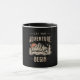 Ilustracion grunge de estilo retro con el texto "Que la aventura comience", puesta de sol, montañas y decoración de pájaros para todos los que les guste la naturaleza y el senderismo