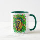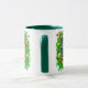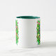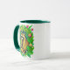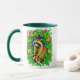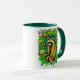 La taza en un lindo mapache se sienta en medio de un jardín, enmarcado por hojas verdes brillantes, margaritas amarillas y tulipanes rosas. Los colores llamativos y los detalles lúdicos le dan al diseño un ambiente divertido y animado, mezclando el encanto de los bosques con una ráfaga de color jardín.