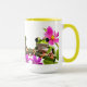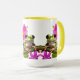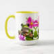 Ai arte que representa lindas ranas verdes o sapos sentados en una rama de flores rosas.