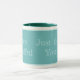 Esta taza tiene frases de color Azul Tropical Claro de "Eres hermosa" "Tal como eres" sobre un fondo Azul de Piscina Tropical y blanco apagado.