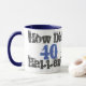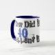 40.º regalo de cumpleaños. Cuarenta años. ¿Cómo ocurrió el 40? es el atrevido mensaje gráfico en esta taza azul y blanca.
