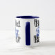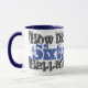 60 años. ¿Cómo ocurrió Sesenta? es el atrevido mensaje gráfico en esta taza azul y blanca.
