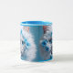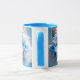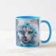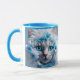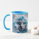 This regular mug is blue with a pretty white cat with blue eyes, attractive and practical