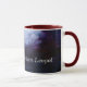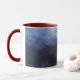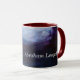 Hermosa taza con arte abstracto morado, azul y blanco. Personalizada con tu nombre.