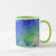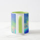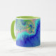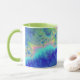 Esta singular taza presenta un arte fractal abstracto que se asemeja a una línea costera en un gradiente colorido desde el azul y el cian hasta el rosa, el amarillo y el verde.