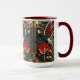 Una hermosa imagen de un diseño Art Nouveau de rojo, negro y oro. formas de flores de bonito, cuentas y hojas de oro y un elegante ventilador rojo.