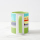 ¡Si usted tiene una sed para un diseño moderno de los mediados de siglo, esta taza retra del lechero de la pequeña ciudad está para usted! El estilo de los años 60, características del diseño minimalistas del arte un dedicado, lechero que hace su mañana redondea. El hombre rubio está llevando los pantalones, la camisa y el gorra blancos lechosos con una pajarita, una correa y zapatos negros. Este hombre de entrega del calcio y de la vitamina D está caminando encima de una acera delantera, llevando la fuente semanal de una familia de leche sana, fresca en las botellas de cristal. El periódico de mañana todavía está en la acera. No se preocupe. ¡Solamente las buenas noticias se permiten en esta ciudad! La acera es rodeada por el tipo de césped verde encontrado solamente en pequeñas ciudades y áreas residenciales. Hay también un blanco, valla de estacas. ¡En la calle, vemos el paseo dulce del lechero! Es un amarillo cremoso, camión de la leche con una raya roja en el lado y las letras rojas que dicen, "LECHERÍA". En el lado opuesto de la calle, vemos un cielo de la aguamarina y las siluetas azules claras de los árboles de cedro. Este dibujo animado kitschy parece una escena fuera de una vieja comedia de enredo de la televisión. Traiga en la torta amarilla con helar del chocolate--¡la torta oficial de todas las amas de casa de la televisión y de sus familias afortunadas! ¡Los huesos fuertes constructivos nunca probaban tan buenos!