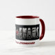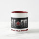 Taza del café con leche con la manija y el borde rojos. Logotipo y REY OF ALL BADASSES de Dave Evans en letras rojas.