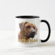 Fotografía de la cabeza de perro de Rhodesian Ridgeback con Rhodesian Ridgeback escrito debajo de él.