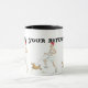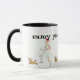 Una taza de ringer blanca con una llanta y mango negros y un bolígrafo y un dibujo de un anciano corriendo con su perro. En su camisa están las palabras, 'Rewired, no Retirado' y justo debajo del borde de la taza están las palabras, 'Disfruta tu Jubilación' en negro. También hay una camiseta y una tarjeta de felicitación a juego.