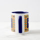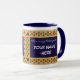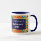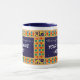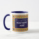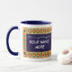 Mug de Ringer blanco con una llanta azul oscura y mango. El diseño de la frontera proviene del patrón islámico de estrellas y lunas pintadas a mano en colores brillantes, delineado con pintura de gouache dorada. Hay un panel, frontal y posterior en azul oscuro con texto blanco, listo para que usted lo personalize con el nombre de su elección.
