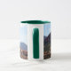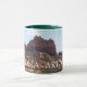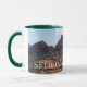 Blanco y verde cazador 11 oz. tazón combinado con la imagen de una pintura acuarela de una formación rocosa predominante y reconocible cerca de la ciudad de Sedona, al pie de los acantilados de Crimson.