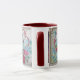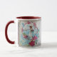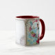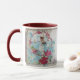 Elegante, elegante, vibrante y clásico diseño floral. Rojas, rosas rosas rosas, flores azules con una paloma blanca cargando una carta en una capa marina. Elaboración gráfica digital en estilo vintage de Bulgan Lumini (c) Diseño fácilmente personalizable con espacio de texto en el centro de la taza. Puedes escribir tus poemas favoritos o dedicaciones personales para tus regalos.