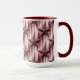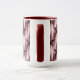Esta taza presenta estrellas de oro rosa metálico en un patrón de rejilla repetida en un fondo rayado. Cada estrella es una forma geométrica de cinco puntas con superficies faceteadas, creando un aspecto cristalino. Las estrellas se colocan en un ligero ángulo, creando un efecto dimensional. La paleta de colores incluye tonos dorados rosas, desde el burdeos hasta el champán rosa. La taza es una taza combinada de 15 onzas. Las tazas están equipadas con microondas y lavavajillas. La taza cumple con los requisitos de la FDA para la seguridad de los alimentos y bebidas.