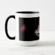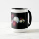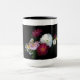 ¿Qué podría ser más encantador que un ramo de rosas de la vieja usanza? Esta taza muestra un exquisito diseño de rosas antiguos rojos, rosados y blancos con un fondo negro.