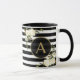 Den esta taza como un regalo de lujo elegante, o compren para ustedes mismos! Este hongo monograma dorado rico a rayas blancas y negras presenta un elemento de fondo monograma de círculo negro bordeado por un oro rico, y el diseño está adornado con hermosos rosas de acuarela blanca y delicados follajes verdes otoñales. El diseño es el mismo en ambos lados, así que es perfecto para todos. Este diseño lujoso le haría un gran regalo, o un placer para usted mismo.