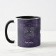 Abran la mística de la astrología con nuestro signo zodiaco - Leo - tazón de café con detalles en color blanco, con el capricho del Rótulo Leo contra un fondo de color morado oscuro con estrellas. Personalizar con tu nombre y ahórrate en el místico reino de los signos y horóscopos de las estrellas. Este moderno tazón, adornado con elegantes detalles, es un regalo perfecto para los amantes de la astrología y para aquellos que aprecian la elegancia personalizada.