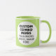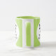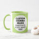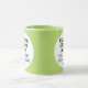 Round LIME GREEN double image frame custom Combo Mug for photo or logo, 11 oz., 3.2" diameter x 3.8" high, with LIME GREEN background double image frame (two individually customizable design areas) providing maximum coverage of the mug in LIME GREEN. See store for more templated font options. The background color has been chosen to closely resemble the combo mug inside and handle color but may not match exactly, due to the difference between printing and enamel tones.