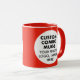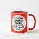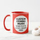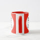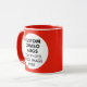 Round RED double image frame custom Combo Mug for photo or logo, 11 oz., 3.2" diameter x 3.8" high, with RED background double image frame (two individually customizable design areas) providing maximum coverage of the mug in RED. See store for more templated font options. The background color has been chosen to closely resemble the combo mug inside and handle color but may not match exactly, due to the difference between printing and enamel tones.