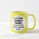 Round YELLOW double image frame custom Combo Mug for photo or logo, 11 oz., 3.2" diameter x 3.8" high, with YELLOW background double image frame (two individually customizable design areas) providing maximum coverage of the mug in YELLOW. See store for more templated font options. The background color has been chosen to closely resemble the combo mug inside and handle color but may not match exactly, due to the difference between printing and enamel tones.